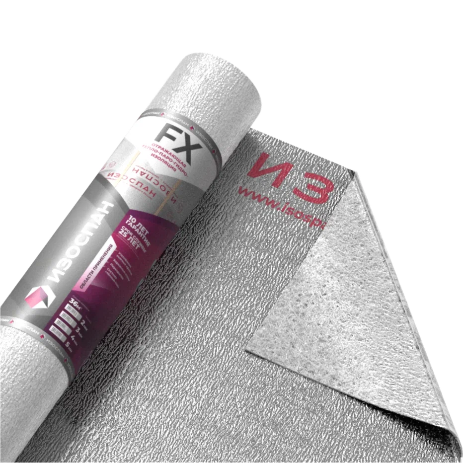 Изоспан FX — это материал 3 в 1: теплоизоляция, гидроизоляция и пароизоляция. Изоспан FX выполнен из вспененного полиэтилена (толщиной от 2 до 5 мм) и металлизированной лавсановой пленки. Благодаря этому уникальному составу, материал надежно сберегает тепло и отводит вредоносную влагу. Выполнив все рекомендации по установке Изоспан FX, можно увеличить срок эксплуатации утеплителя и прочих материалов, а также значительно сэкономить на отоплении.