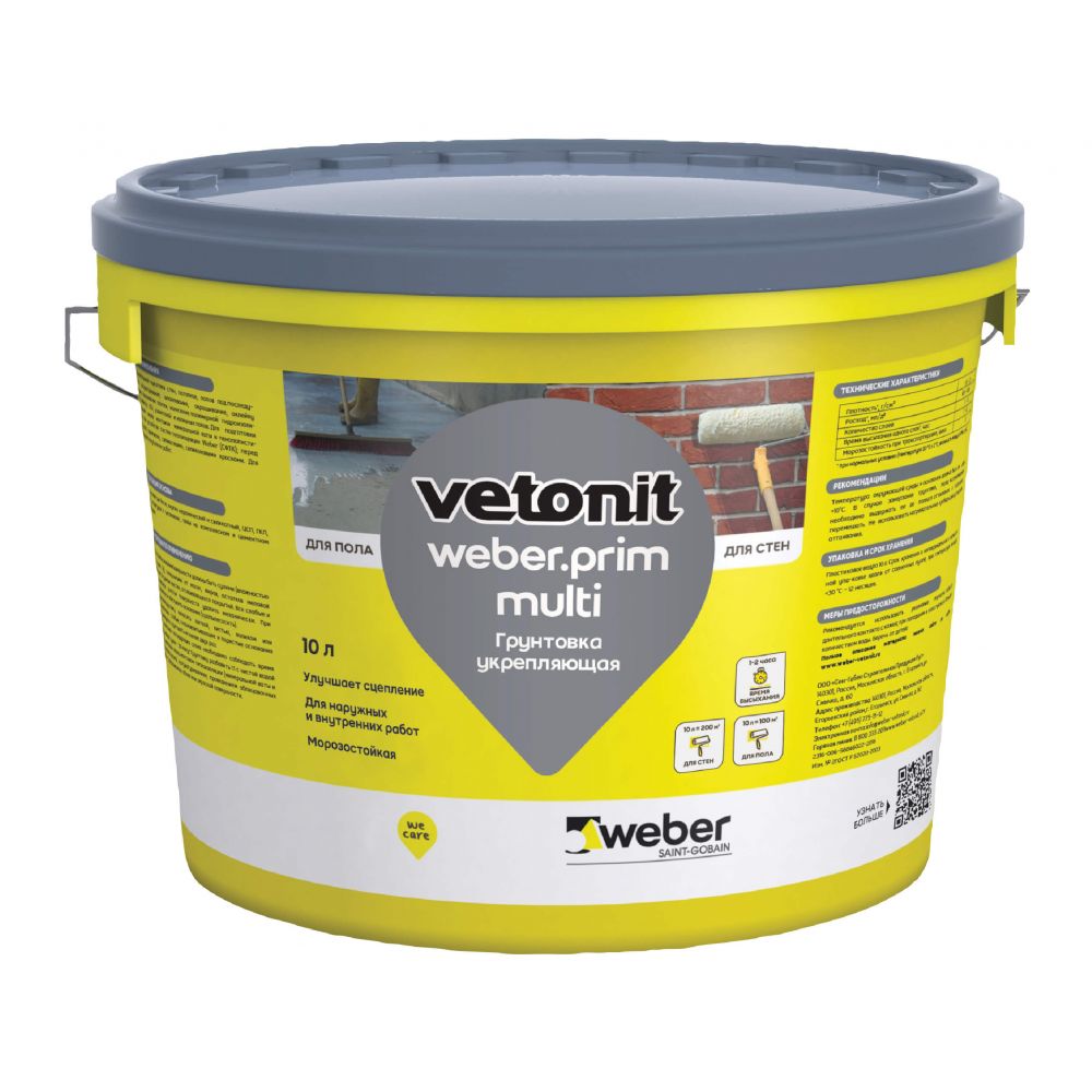 Грунтовка универсальная Вебер прим мульти (Weber.Prim Multi) подходит для укрепления основания и качественно подготавливает стены, потолки, полы к покрытию. В дальнейшем, на подготовленную поверхность наносят штукатурку, краску, обои, шпаклевку, плитку, полимерную гидроизоляцию, составы для выравнивания полов. Благодаря высокой концентрации полимеров использование продукта идет с расходом на 100 кв.м для пола или на 200 кв.м для стен (при этом разбавляют в соотношении 1:1 с чистой водой). Используется на бетонных основаниях, кладках из кирпича, ячеистого бетона, цементно-песчаной стяжке, основаниях из гипса, старой стяжке, а также применима к полу с комплексным и цементным вяжущем.